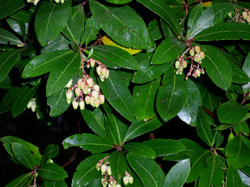 Brigitte, dieses von dir erwaehnte Rindenfoto war ein Bild vom verwandten Arbutus andrachnoides , von dem ich auch noch ein Ganzkoerperfoto habe. Siehe unten!Der weiter verbreitete Arbutus unedo blueht hier auch gerade und die ersten Fruechte tauchen auch schon auf. Die Blaetter sind zumeist eher matt und nicht ganz so glaenzend wie man meinen koente.
