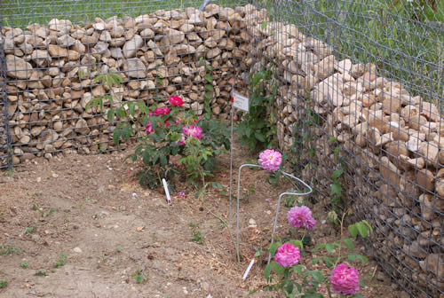 Bei jedem Loch das ich aushebe, fällt die Hälfte als Steine an. Mit der Zeit nahmen die Steinhaufen im ganzen Garten langsam Ueberhand. Gabionen wären die Lösung, aber viel zu teuer.So bog ich Kompostgittersilo gerade, mit Draht band ich sie zusammen und stellte sie an den Maschendrahtzaun. Grub sie am Fuss 10 cm in die Erde ein und nun konnte ich füllen. Varianten ergaben sie dann auch noch mit grösseren und kleineren Steinen. Für die kleineren Steine zog ich noch ein Hasengitter (enge Maschen) innen hoch. Nun habe ich fast ein Mikroklima hinter den Steinen, da hier oft der Wind durchbläst.