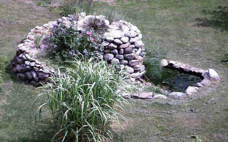 Wir waren mal in der chilen. Atacamawüste und fanden die Steintürme so nett. Jeder der vorbei geht legt einen neuen Stein auf - so bleiben die Wege sichtbar. Deshalb bauten wir aus zerbrochenen Rasenkantensteinen und Findlingen so einen Turm nach. Wir haben im unteren Bereich noch eine Höhle für Kröte oder Blindschleiche angelegt und nun mit einer Rose umranken lassen. Einen hässlichen Wassertrog verschönern wir derzeit immer wieder mit Fundsteinen vom nahegelegenen Feld. Den Bauern freuts und uns auch.
