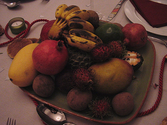 Zu Weihnachten haben sich die Kinder meiner Schwester gewünscht, daß es exotische Früchte gibt. Da sie sich das auch immer zu den Geburtstagen wünschen und sie Mangos, Rambutan und Mangosteen (meine Lieblingsfrucht) und ähnliches schon kennen, gab es jetzt sogar ein paar Früchte, die ich selbst noch nie probiert habe. In dem asiatischen Lebensmittelgeschäft konnten sie mir die Namen auch nicht nennen...