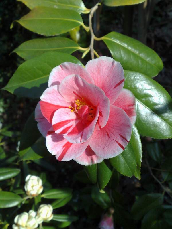 C.japonica rusticana Yukibata Tsubaki ,ein 18 Jahre alter Busch,jetzt ca.120 bis 140cm hoch.Gesamtbilder haben den Nachteil,daß man die einzelnne Blüte nicht mehr so genau erkennt.Mache die Bilder mit Nokia N95 ,aber die Leica R7 ,die ich früher benutzte ,ergab auch keine besseren Resultate,zumindest nach einscannen...Werde deswegen wieder Einzelblüten photographieren.@violatricolor : Die Camellia japonica - Kultivare sind teilweise nur deshalb so hoch ,weil sie in günstiger Lage einen zweiten Trieb im oberen Bereich machen,der bei mir fast immer unbeschädigt durch den Winter kommt und sich im daraufffolgenden Jahr verzweigt.Will man weniger hohe Pflanzen ,schneidet man den einfach im Herbst ab.