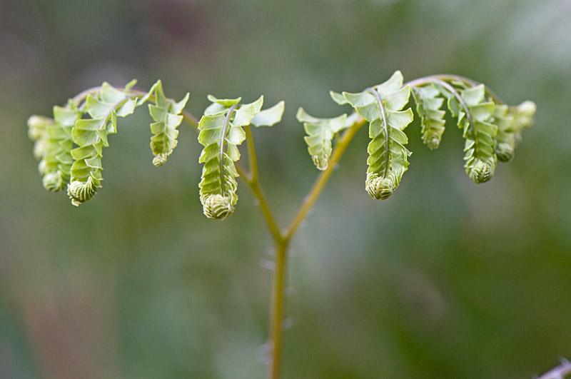 und der Elefantenrüsselfarn Dryopteris atrata rollt seine Rüssel aus.