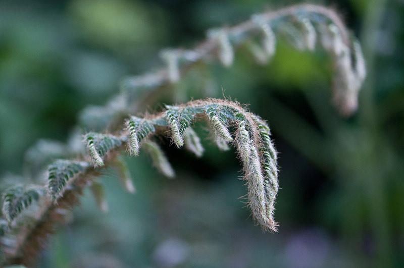 Der Glanzschildfarn Polystichum polyblepharum glänzt beim Austrieb absolut nicht, ist stattdessen stark behaart.