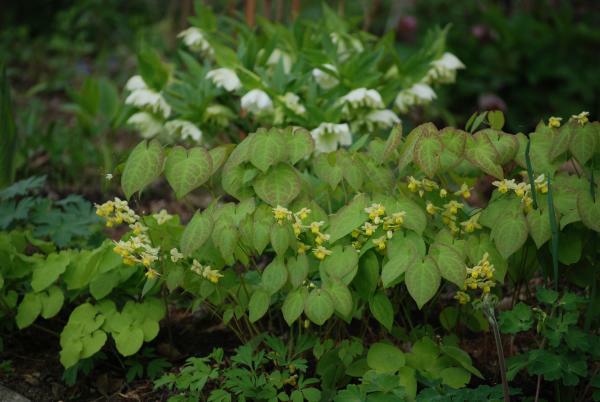 Wundervolle Bilder zeigt ihr hier! Und auch die vom letzten Jahr von hederatotal sind sehenswert.Ich möchte euch einige Kombinationen mit Epimedien zeigen.Das von mir andernorts als langweilig bezeichnete E. x versicolor 'Sulphureum' spielt in meinem Garten eine Rolle als Beetabschlusspflanze, weil ihr Laub Kanten gut verdeckt und von anderen Stauden überwachsen werden kann, ohne dass das die Pflanze stören würde.Daher war ich sehr überrascht, wie diese Pflanze hier, die heuer erstmals genug Blüten für richtige Wirkung besitzt, gut mit der dunklen Helleborus harmoniert.