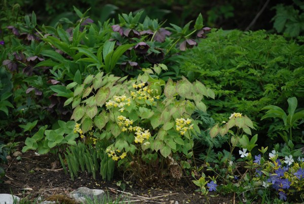 Wundervolle Bilder zeigt ihr hier! Und auch die vom letzten Jahr von hederatotal sind sehenswert.Ich möchte euch einige Kombinationen mit Epimedien zeigen.Das von mir andernorts als langweilig bezeichnete E. x versicolor 'Sulphureum' spielt in meinem Garten eine Rolle als Beetabschlusspflanze, weil ihr Laub Kanten gut verdeckt und von anderen Stauden überwachsen werden kann, ohne dass das die Pflanze stören würde.Daher war ich sehr überrascht, wie diese Pflanze hier, die heuer erstmals genug Blüten für richtige Wirkung besitzt, gut mit der dunklen Helleborus harmoniert.