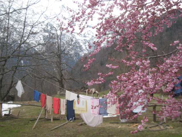Heute Nacht hatten wir leichten Frost, jetzt 2°C, blauer Himmel und Sonnenschein, über dem Ort noch etwas Dunst. Unser Berg weiter oben steckt noch im Nebel.