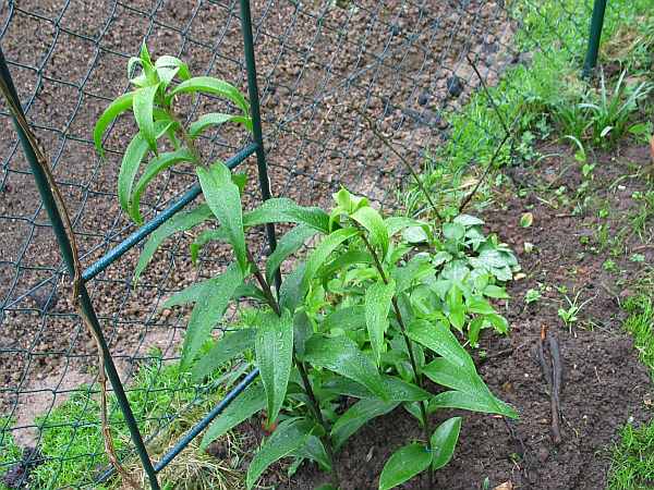 lilium tsingtauense habe ich in der anfangszeit meines hobbys mal aus samen vermehrt. seither wandert sie durch meinen garten...mal hierhin, mal dorthin verpflanzt, wenn sie blühfaul wurde. gebe zu mich nicht mehr so um die gekümmert zu haben. an der jetzigen stelle scheint's ihr aber zu gefallen. momentan 4 triebe + ein paar blättchen von jungzwiebeln. wahrscheinlich über schuppen von den hauptzwiebeln. bisher habe ich bei der noch keine stängelzwiebeln entdecken können, trotzdem sie eine asiatin ist. ich würde euch gerne was abgeben, aber leider setzt sie keinen samen an. ich vermute, weil ich sie über schuppen auch mal vermehrt habe + wohl alle 4 identisch sind. mal sehen...wenn ich es nicht vergesse werde ich im spätsommer mal nachbuddeln + versuchen ein paar schuppen abzumachen.