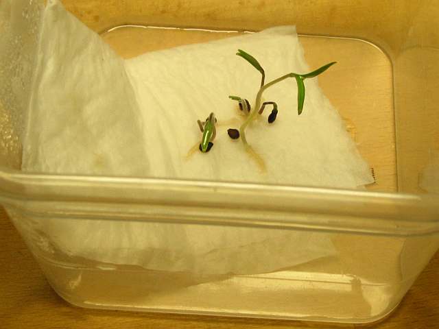 8)Na ja, ganz so verrückt bin ich doch nicht. Es ist nur ein Keimtest: von einer Tomatenpflanze, die der Braunfäule relativ lange widerstanden hatte, hatte ich noch keine Samen geerntet, als ich sie dann doch ausreissen mußte. Zwei Tomaten mitgenommen und dann vergessen...Neulich habe mich wieder daran erinnert, sie vom Computergehäuse gekratzt, einige Kerne aus der Hülle gehackt, sechs Stück auf feuchtes Papier, der Rest eingetütet. Ich muß sagen: Tomatensamen sind wirklich hart im Nehmen! Keimrate lag bei 100%...Da hat es jemand offensichtlich sehr eilig!