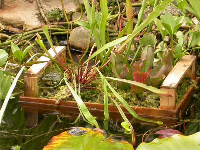 Ich hab vor ca. 10 oder 15 Jahren mit einer schwimmenden Insel in einem Baukübel gute Erfolge. Die S. purpurea wuchsen da sehr gut und haben alle Winter in sehr gutem Zustand überdauert. Wenn sie einfach im Wasser schwimmen braucht man sich auch bei längeren Urlauben keine Sorgen machen. Die grünen Styrodurplatten sind am besten. Wichtig ist die runde Plattform im Kübel so klein zu halten das der Wasserstend bis ins untere Drittel sinken kann.Das Moos überdeckt bald die Lücke.Hab diese Idee aus einem der ersten Bücher über carnivore Pflanzen die auf den Markt kamen. Nur die empfindlicheren Gesellen wie Drosera multifida und die Venusfliegenfalle sind regelmäßig nach harten Wintern verschwunden. Hab wegen Umzugs aber die Reste verschenkt. Dort leben sie ausgepflanzt aber nicht so gut. Die Konkurrenz ist einfach zu groß. Die Insel war besser zu pflegen.