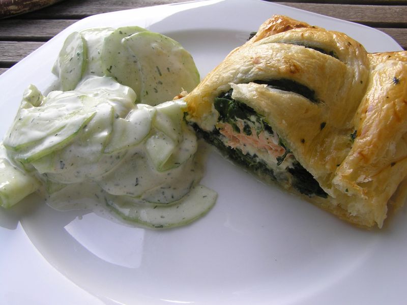 lachs mit blattspinat im blätterteig, dazu gurkensalat
