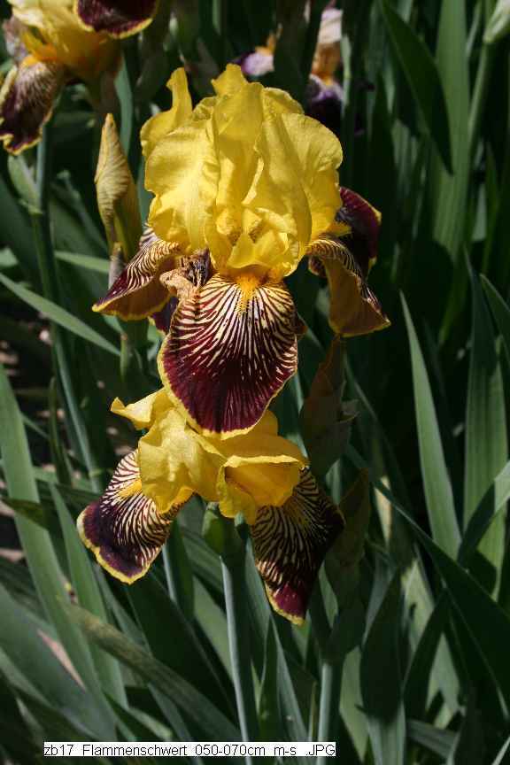 Die reisst mich vom Hocker. Woher stammt die? Pfauenfeder (G&K 1928) Neu!Domblätter hellgelb, Hängeblätter violettblau mit hellgelbem Rand, außerordentlich reichblühend und von.ganz niederem Wuchs. (G&K 28)Iris germanica Mithras (G&K), Neuheit für 1910-11.Mithras ist in seiner ganzen Erscheinung ähnlich den Sorten: Gajus und Lord Beaconsfield; doch ist die Farbe so bedeutend, viel intensiver und reiner und die Einzelblüte so viel edler, dass wir sie zu den besten der heutigen Iris germanica zählen dürfen. Die Domblätter sind lichtgelb; Hängeblätter tief und klar weinrotviolett mit sehr scharf abgegrenztem gelben Saum; sehr reichblühend. (G&K 10-1)Dombl. lichtgelb, Hängebl. klar weinrotviolett mit gelben Saum, reichbl., edler Bau, 70 cm. (G&K 24-5)Pfauenauge. Der Dom ist rein olivegelb, die unteren Blätter in auffallendem Farbengegensatz dazu bräunlich pflaumfarben mit scharf sich abhebendem. olivegelbem Rande. (G&K 6-7)50 cm (G&K 24-5)Kommt dafür in Frage.Ich hab Pfauenauge,(Nachbestimmt, unter falschem Namen bekommen.)Mithras müsste sehr Ähnlich sein deshalb bin ich mir nicht sicher ob ich den richtigen Namen vergeben habe. Beide Sorten mit Namen gibts nirgens, deshalb gibts auch keine 100% Sicherheit.Ich würde ganz schüchtern um ein Rhizom davon betteln.So was hab ich auch....Nibelungen ist es nicht, aber was ist es? Blüht spät mit flavescens, etwas niedriger als flavesens, Blüten nicht viel größer als diese. Das Rot ist ein tiefdunles Weinrot. Ich bin mir wegen der kleinen Blüten nicht sicher, ob es überhaupt eine benannte Sorte von G+K oder Arends ist oder eine noch ältere Hybride von Iris Variegata.