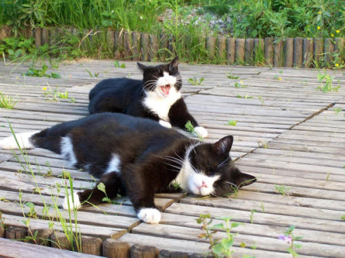 Vor unserem Haus haben wir dunkles Pflaster, dass sich vormittags schön aufheizt. Das ist gegen Mittag der Katzentreff der Nachbarskatzen
