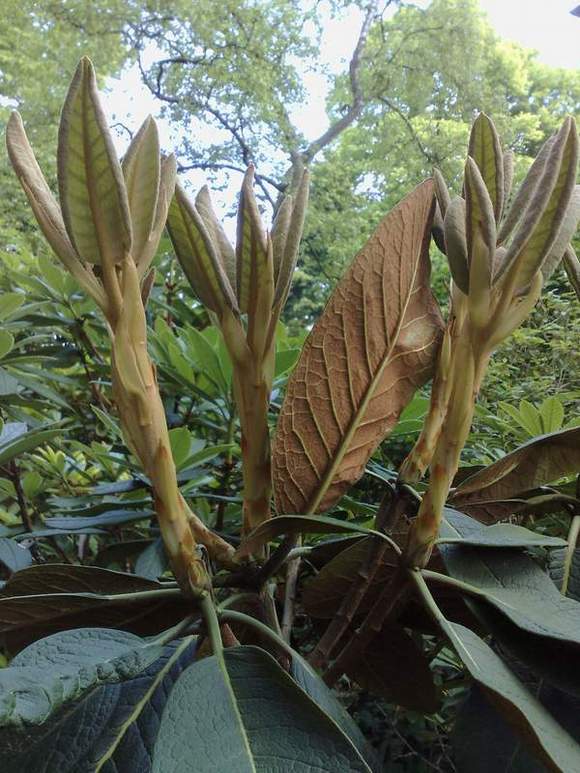 Rh.falconeri ssp.eximium mit gelblich behaarten Austrieben wächst am Hause seit 17 jahren langsam,scheint sich aber jetzt etwas kräftiger zu entwickeln.Diese Großblattarten brauchen extrem viel Wasser,so daß der Nachbar schon mal fragt:'Gießen sie schon wieder?Ist doch garnicht heiß und hat doch vor ein paar Tagen geregnet'.