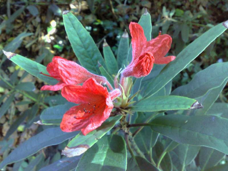 Rh.griersonianum.Dies ist die zweite Pflanze,die ich 1997 erworben hatte und im zweiten Jahr auspflanzte.Am schattigen Standort ist sie hier voll winterhart.Sie wächst hauptsächlich in die Breite(jetzt über 2m breit,aber nur 50 bis 80cm hoch) und würde am sonnigen Standort sicher mehr in die Höhe wachsen,aber dann wohl Frostschäden erleiden oder gar erfrieren.Die erste Pflanze überstand am selben Standort im Winter 1995/96 sogar -15 C unter Luftpolsterfolie;fiel aber im folgenden Sommer dem Phytophtora zum Opfer.Seit zwei Jahren keine Folie im Winter mehr und die -9,5 C im letzten Winter schienen ihr nichts anzuhaben.Eine unangenehme Eigenschaft ist,daß die Pflanze im September nachtreibt.Diese Triebe kommen nur durch ,wenn die Fröste spät einsetzen.