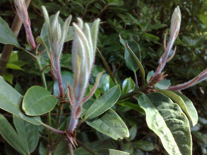 Bitte, bitte! Das sind ja sehr prächtige Burschen - wohl Rh. 'Roseum', die vor allem in Norddeutschland häufigste Sorte. Bei den meisten Rhododendren ist während und auch kurz nach der Blüte noch kein Neutrieb zu sehen, und warum sollte man später noch so genau hinschauen?