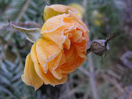 Ein kurze Rückmeldung- das Hauptmotiv würde ich stärker vom Hintergrund trennen, d.h. den Hintergrund ruhiger gestalten- bei der Aufnahme, wenn es geht, dem Hauptmotiv mehr Raum lassen. Bei der Nachbearbeitung könnte man jetzt unten etwas wegnehmen, damit es oben nicht so drückt.Eine geöffnete Rose plus Rauhreif mit ausreichender Schärfentiefe vor unscharfem, ruhigen Hintergrund bei eventuell schlechten Lichtverhältnissen – ich komm ins Schwitzen