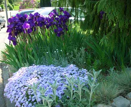 Schön finde ich auch diese Kombination, die sich im Laufe der Jahre zusammengefunden hat.Dunkellila Iris, Polsterphlox in flieder zu Füssen und Stachys der den grauen Ton in den Irisblättern aufnimmt, ebenso wie das graue Gras. Überhaupt finde ich graulaubige Stauden schön zu den Iris.