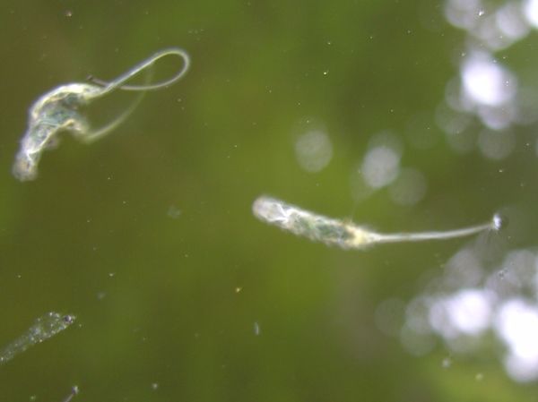 Was sind das für Tiere, die in meiner Vogeltränke wimmeln?Glasartiger Körper (länge etwa 2-3 mm), langer Peitschenschwanz, mit dem sie sich fortbewegen.