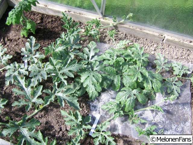 Heute habe ich mit der welken Zuckermelone kurzen Prozess gemacht und eine Melone aus der Reserve, ebenfalls veredelt, gleiche Sorte, ausgepflanzt. Bei der veredelten Katanya Wassermelone hatte sich eine Wurzel von der Edelsorte zum Boden entwickelt. Die hab ich auch gleich mit gekappt. Hoffentlich geht das gut und endet nicht wie bei der Zuckermelone. Aber auch da haette ich noch veredelten Ersatz. Die Rankstricke sind jetzt auch wieder kreuz und quer gespannt. Es kann also losgehen :-)Hier ein aktuelles Video der letzten 3 Tage im Zeitraffer (Nächte rausgeschnitten, 8 MB, 42 Sekunden) : http://www.melonengarten.de/images/film1.wmvAlfi