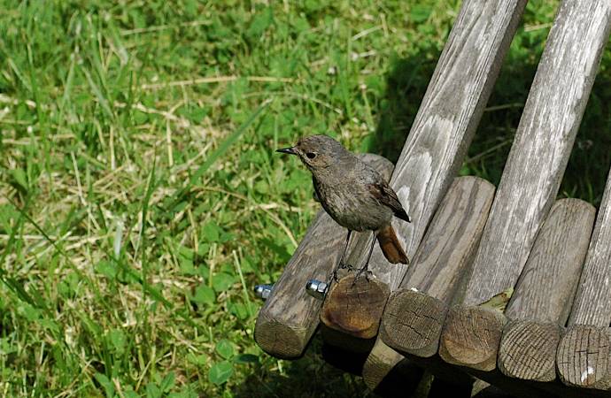 In meinem Garten mit zwei sehr hohen alten Tannen und alten Obstbäumen als beliebter Futterplatz brüten sehr viele verschiedene Vögel und im Dachgiebel 'Rotschwänzchen'.Heute war grosse Aufregung über der Wiese:Die 'Rotschwänzchen hatten ihre ersten (?) Flugstunden, herzallerliebste, naiv zutrauliche Jungvögel mit noch breiten Babyschnäbeln.Sie flatterten vom Birnbaum zu den Gartenstühlen an meinem kleinen Teich, tranken dort noch unbeholfen mit Füssen im Wasser, spielten Fangen mit fast Purzelbäumen über dem Holunder und übten Kurven und Sturzflug. Übermütige Vogelkinder.Was mich am meisten beeindruckte, waren die markanten Klicklaute, mit denen die Vogeleltern ihre Jungen animierten zum fliegen und jagen. Sie machten ihnen vor, flatternd, fast in der Luft stehend, ca 1m über der Margeritenwiese Insekten zu fangen. Dort schwirren zur Zeit Unmengen rum.Auch wegen meiner Katzen blieb ich in der Nähe, um die lustigen, noch arg unbedarften Vogelkinder wenigstens ein wenig zu überwachen, die mich fröhlich umflatterten. Meine Katzen fanden das logisch auch höchst spannend!Die Vögelchen kamen bis etwa 2m in meine Nähe, sassen lange wippend dort, flogen ihre Runden und setzen sich wieder.Leider hatte ich an meiner Kamera nur ein schwaches Tele dran, sonst wären sicher ein paar schöne Schnappschüsse rausgekommen.So war's ein wunderschönes Erlebnis