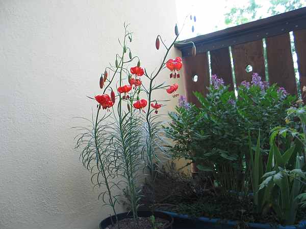 Hier noch einmal ein Ganzfoto meines Topfes mit Lilium pumilum die Zwiebeln waren sehr klein (so. ca.2,5 cm) haben sich aber zu prächtigen Pflanzen entwickelt. Sie stehen 70 cm hoch ohne Topf. Die eine die sich neigt wäre sogar noch höher. Sie hat 12 gute Knospen, eine letzte 13 ist verkümmert. War wohl nicht genug Nahrung da, oder die Pflanze ist abergläubisch. Die Lilium davidii var willmottiae sieht sehr ähnlich aus, hat aber dunkle Punkte auf der Blüte, die auch nicht ganz so knallig rot ist. Außerdem ist sie kräftiger.