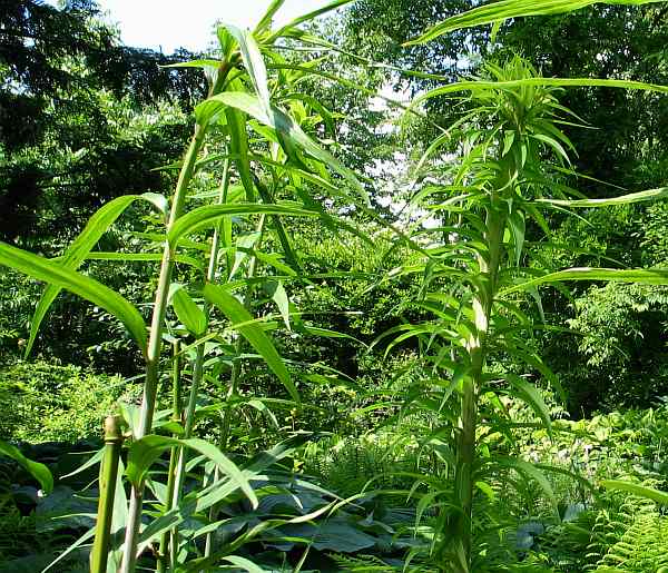 Bin gespannt was das Uls (unidentified lilium species) ist.Hier mal die verbänderte auratum aus dem Bot Garten. Waren schon letztes Jahr virusinfiziert. Haben alle aber geblüht und dann auch völlig unauffällig ausgesehen. Sie sind jetzt so ca. 1,7 meter hochEine ist ausgefallen weil so ein Gierling sie ausgegraben hat. Der wird irgendwann einmal ganz aus Versehen eine Gärtnerhacke im Rücken haben.