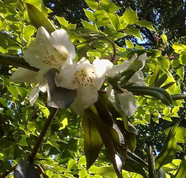 Rh.maddenii ssp.maddenii KR1695.Diese Spezies ist sehr variabel.Diese eher kleinblättrige Form könnte in der Härte an die ssp.crassum herankommen,daher diesen Frühjahr versuchsweise ausgepflanzt.Sehr stark süßlich duftend.Eine großblättrige Form Calophyllum Group verlor alle Blätter letzten Winter.Daher wieder eingetopft,da sie von unten wieder ausschlägt.Blüte vom Regen 'gebräunt'(wie häufig bei Magnolien oder Kamelien)
