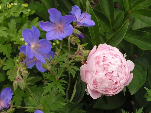 das ist ja eine originelle Blüte, Irisfool!dies sind Geranium Johnson Blue und eine unbekannte Strauchpfingstrose