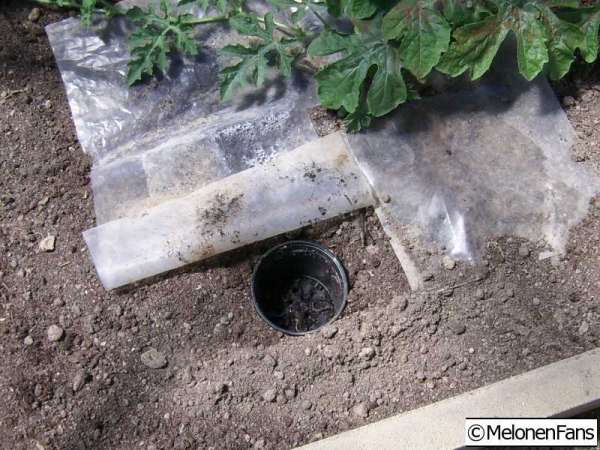 Und hier hab ich mir was einfallen lassen um mir das Gießen einfacher zu machen. Vorher verteilte sich das Wasser überall und die Ranken waren nass. Jetzt passiert das nicht mehr, da das Wasser direkt in den Wurzelbereich kommt und sich somit nicht mehr unterhalb verteilt und vor allem auch die Stengel trocken bleiben.