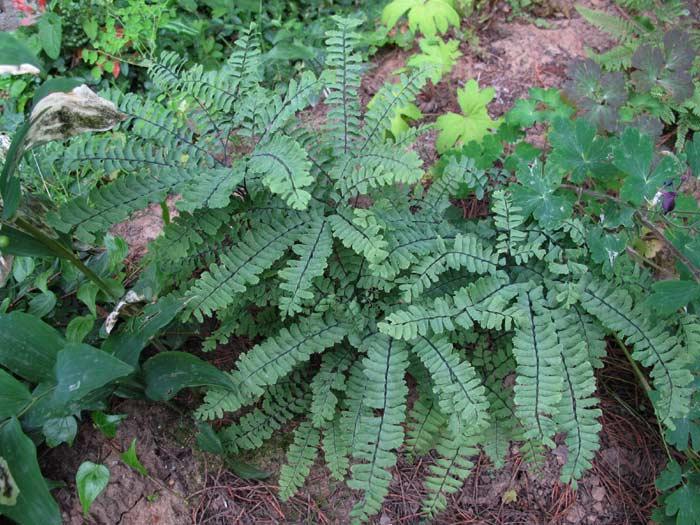 @Nina, die Farne baruchen noch etwas, dann aber wird Dein Farntal schön.Hier sind meine Adiantums. Links Adiantum aleuticum ´Japonicum´ rechts Adiantum pedatum. Links hinter der Hosta ´Blue Angel´ treibt der Rotschleierafrn Dryopteris erythrosora aus. Ganz links vorne Athyrium niponicum ´Metallicum´.Das zweite Exemplar meines Polystichum pulcherrimum ´Bevis´Polystichum polyblepharum, der japanische Glanzschildfarn sieht wirklich wie lackiert aus, daneben die ebenso lackierte Hosta ´Devon Green´.