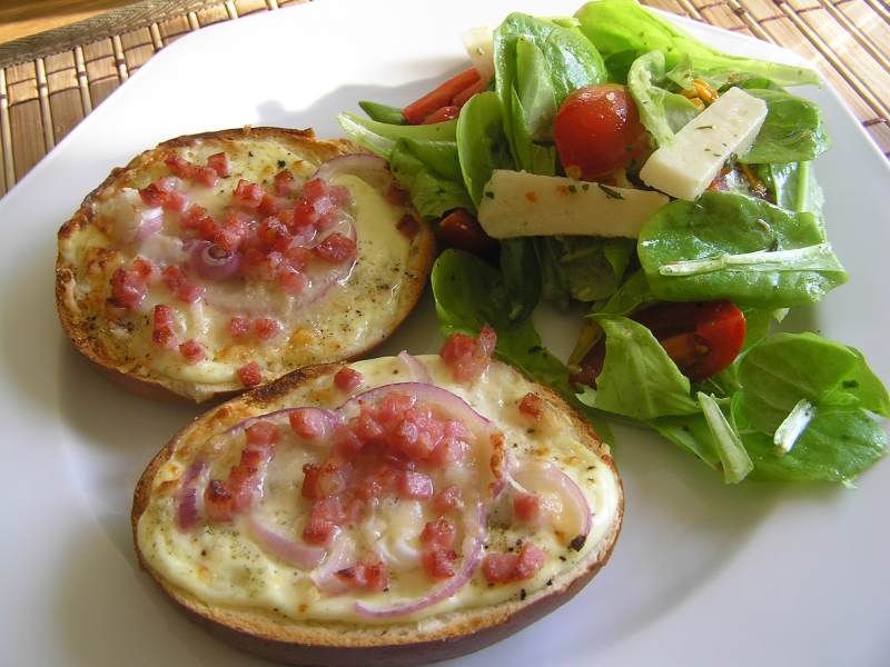 nach dem wochenendeinkauf musste es wieder flott gehen. laugenbrötchen aufgeschnitten, creme fraiche, rote zwiebel, speckwürfel, salz u pfeffer, im ofengrill kurz gratiniert. dazu salat mit tomätchen, parmesan und basilikum