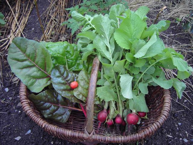 Radieschen, Mangold, 1 Erdbeere.Von der Hand in den Mund: viele Walderdbeeren, schwarzen Johannisbeeren und Jostabeeren