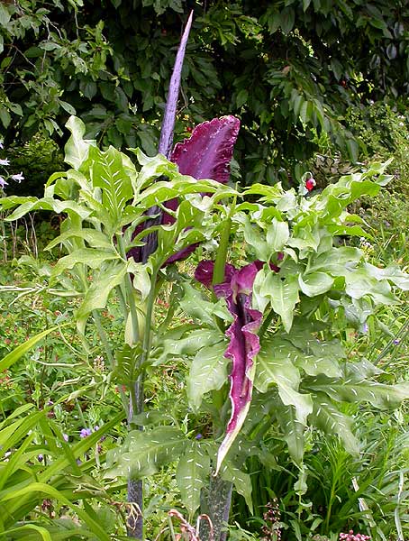 Hier blüht Dracunculus vulgaris mit seinem berühmten "weitstreichenden Duft". Zwei Blüten sind auf, die dritte werden wir auch noch überstehen.