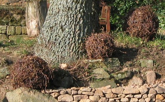 Man kann unterschiedlicher Meinung darübersein, ob diese Kugeln ästhetisch sind. Originell sind sie gewiss denn selbst geflochten mit dem Zweck Birkenreisig zu verwerten.Bitte zeigt auch Eure Zierstücke.