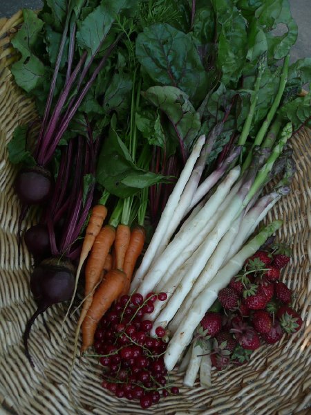 Einige WilderdbeerenEine handvoll schwarze Knorpelkirschen zum TestenMöhren (Sorten: "Fanal", "Erstling", "Purple Dragon")2 gelbe/orange Eiertomaten aus China von einer Sorte ohne Namen6 gelbe "Mikrotom"-Tomaten1 "Wildtomate aus den Anden"3 "Green Sausage" Tomaten