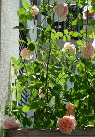 Kletterrosen sind bei mir ein heikles Thema. New Dawn hat es nicht geschafft, und nach dem letzten Winter mußte ich mich auch von meiner schönen Leverkusen verabschieden. Beales gesteht ihr Zone 4 zu, das muß leider korrigiert werden. Nun ja, die nackten Drähte wollten bewachsen werden, so habe ich auf Anraten eines Forummitglieds die Nordlandrose zur Kletterrose umfunktioniert. Und was ich zunächst als Notlösung betrachtet habe, entpuppt sich als Volltreffer: Im dritten Jahr nähert sie sich dem Dach, kein Zentimeter ist erfroren. Das Laub gesund und üppig, die Blüten wunderschön - im Aufblühen kräftig rosa, später zarter. Und vor allem: sie wird geführt als schwach bis nicht duftend, was überhaupt nicht stimmt - wunderbarer Alte-Rosen-Duft. Er strömt durch die geöfneten Fenster ins Haus, damit habe ich am wenigsten gerechnet. Das ist erst der Anfang, das Bild ist vom Wochenende