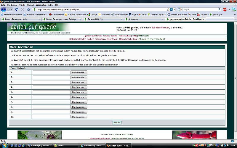 wenn du auf der 10er Liste bist, klicke in der ersten Zeile, nach dem leeren grünliche Feld, das graue "Durchsuchen ..." anmit der 10er Liste kannst du gleichzeitig 10 Bilder in verschidene Alben hochladen