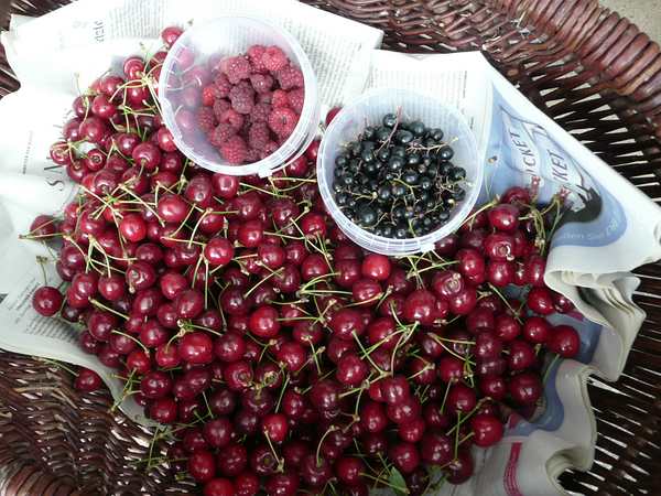 Hier ist mein Erntebild vom letzten Mittwoch, hatte in der Zwischenzeit mit der Verarbeitung zu tun, es kamen noch Sauerkirschen dazu. Außerdem gab es noch Schnittsalat und Romanasalatherzen. Kräuter sowieso jeden Tag, für Tee: Zitronenmelisse, Minze, Malve, Zitronenverbene, Jiaogulan, Stevia, mex. Süßkraut, Mutterkraut, Johanniskraut. Inzwischen stehen schon wieder Himbeeren da.