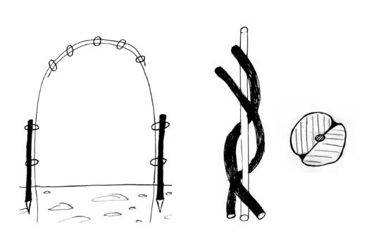 Viele Fragen!Zunächst: Biegen (das heißt plastisches Verformen!) ist nicht notwendig und vor allem kontraproduktiv, weil dann die Elastizität (= Federwirkung) zerstört wird. Der Stahl ist so dünn und elastisch, daß er nach dem senkrechten Einstecken in die Erde (80 cm sollten es für einen großen Bogen schon sein) von selbst in einen Bogen fällt, wie ein Schilfrohr im Wind. Man muß nur die beiden Bögen im Scheitelpunkt packen und mit vielen Runden dünnen Drahts zusammenbinden. Dann die jeweiligen Enden am gegenüberliegenden Stab festbinden und jeweils in der Mitte nochmal, insgesamt also 5 Bindestellen. Das sollte reichen. Die Skizze 1 verdeutlicht die Vorgehensweise. Bei mir stand der Bogen in der Einfahrt. Da konnte ich die Stangen noch zusätzlich an 2 Zaunpfählen aus Fichte (8 cm Durchmesser) befestigen, ebenfalls mit dünnem Draht. Das wars!Das Ding ist so filigran und elastisch, daß es auch bei Sturm dem Wind kaum Widerstand bietet. Das macht es so sicher. Die hochwachsenden Hainbuchen bieten später zwar steigenden Windwiderstand, aber auch hohe Elastizität und Festigkeit. Baume stürzen schließlich auch nicht so schnell um. Skizze 2 zeigt Triebe mit dem Stahlstab in der Mitte in der Frühphase.Skizze 3 zeigt im Querschnitt zwei eng miteinander verwachsene Hainbuchentriebe, die an den Nahtstellen eine gemeinsame Rinde haben. In der Mitte liegt der Stahlstab.