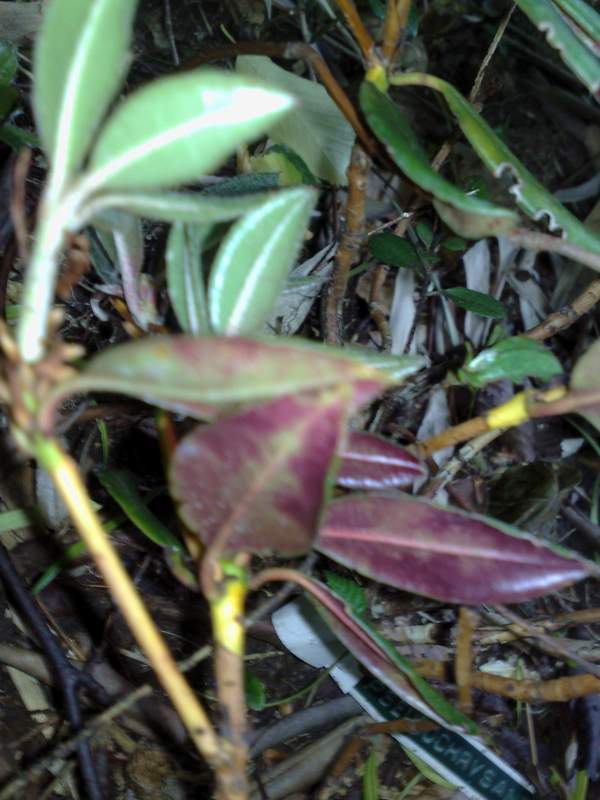 Dass die Sämlinge einige Wildrhododendren zu Anfang eine rötliche Blattunterseite aufweisen, ist nicht ungewöhnlich.Aber dieser Maculiferum-Sämling (offen polliniert) hat die rote Unterseite inzwischen in der 4. Blattgeneration (= nach 4 Jahren) behalten. Ich bin sehr hoffnungsvoll gestimmt.