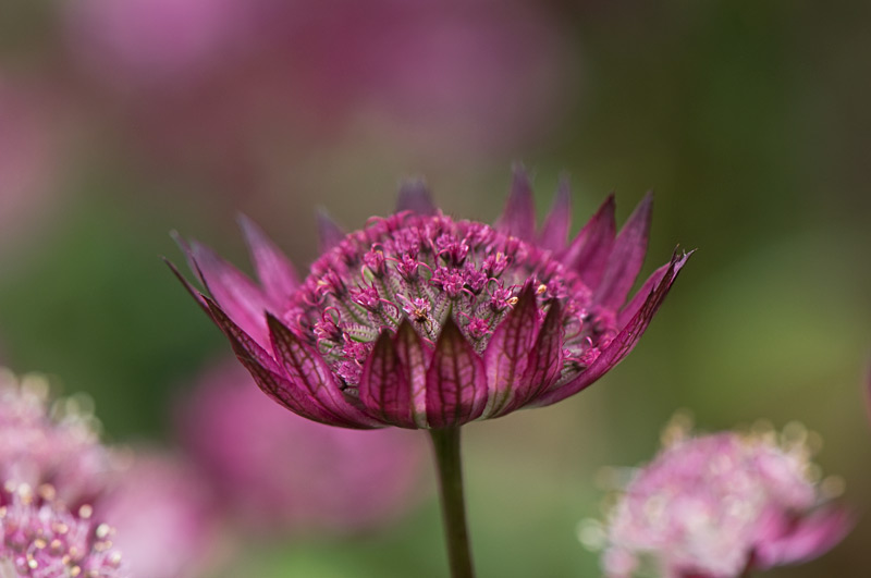 Astratien -find ich- sollten nicht auf großblütige grelle Farben gezüchtet werden. Es sind so irre liebenswürdige Pflanzen, die vor allem als Verbindungsglied mit ihren sanften Farben für ein wunderschönes Überleiten zu anderen Prachtstauden sorgen. Astranzien untermalen dann die Farbenpracht der Übrigen.