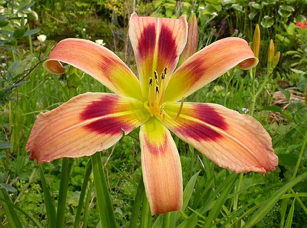 Und hier das Rätselteil vom letzten Jahr. Sollte ja eine Sorte aus dem Sortiment der Gräfin sein.Sieht etwas aus wie Calico Spider nur kleiner, niedriger und der Blütenstengel(etwa 40-50cm hoch) hängt meist waagrecht.Keine Ahnung was das für eine ist.Callis hat sich ja letztes Jahr schon versucht die Sorte herauszufinden.