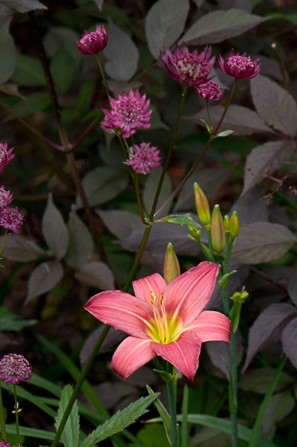 Hemerocallis ´Little Business´ vor dem schwarzen Holunder ´Black Beauty´, umgeben von vielen roten Astrantien. Ich liebe diese etwas düstere Kombination.Clematis ´Rüütel´ steht auch noch daneben.