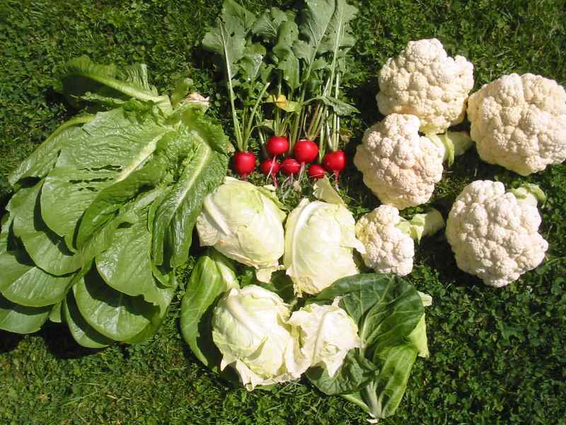 !)Ich hab heute einen Bund Lauchgrün geerntet, weil ich den Lauch umgepflanzt und deshalb beschnitten hab. Außerdem den Rest vom Spitzkohl, der anfing, zu gammeln, weil die Blätter vom Stamm abplatzten (deshalb sieht der so zerfleddert aus) und den restlichen Blumenkohl, bevor er mir, wie letztes Jahr, zu alt wird (ein Teil ruht jetzt schon im eisigen Schrank). Und immer noch welche von den fetten Radieschen aus dem Innern der Bohnengestelle, auch bei mir nagen teilweise die Schnecken dran. Römersalat zum Abwinken