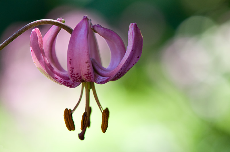 eine Martagonlilienblüte. Den rosa HG bilden rote Astrantiablüten in der Sonne.