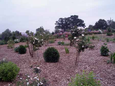die asiatischen Strauch-Wildrosen und im Vordergrund eine Reihe geretteter Polyanthas.