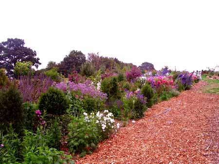 Nun geht´s um die Ecke und zur Linken liegt die Nordreihe.Dort wachsen (hinter, zwischen und unter den arg üppigen Stauden und Einjährigen