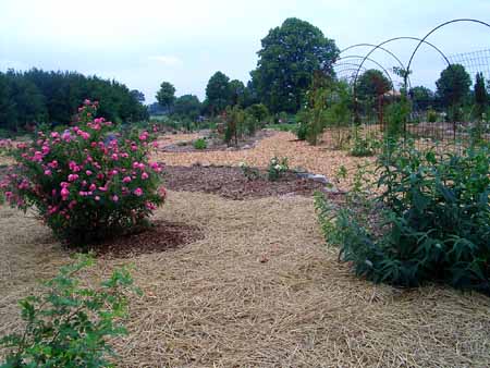 Die Bereiche für die das Shreddermaterial nicht ausgereicht hat sind mit Stroh ausgelegt. Wenn da erstmal mehr Stauden zwischen stehen fliegt es auch nicht mehr so schnell weg.
