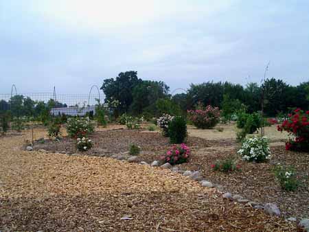 Nach Westen und in der Mitte stehen mittelgroße, öfterblühende Multiflora Hybriden und davor wiederum Polyanthas.Nach Süden schließt sich der Chinensis Bereich an, auch da stehen die kleineren Pflanzen am vorderen (westlichen) Beetrand wo sie etwas geschützter sind.Der Blick geht am vorderen Rand mit den Polyathas entlang zurück Richtung Norden, Bogengang und Sonnenuntergangsbereich dahinter.