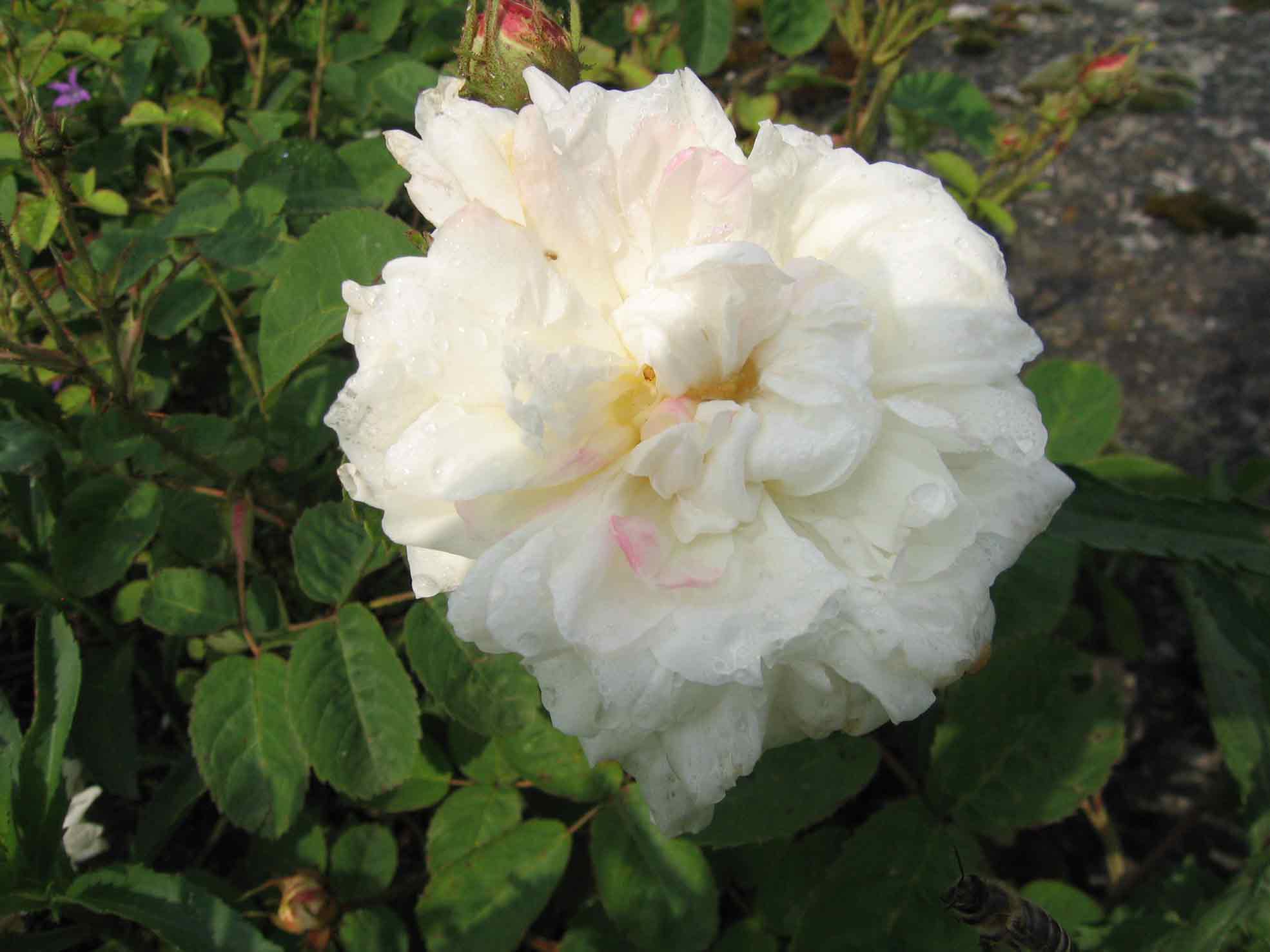 Bei Maxima kündigt sich allerdings bereits der Rost an, eine unausweichliche Folge der Feuchtigkeit. Stefans De la Grifferaie hatte ich eigentlich nur zunächst und als Verlegenheitslösung an die Wand gesetzt. Aber nachdem sie im ersten Jahr bereits auf 1,80 m hochgeschossen war, wolte ich sie nicht mehr umpflanzen. Jetzt muß sie als KLetterrose noch ein bißchen üben